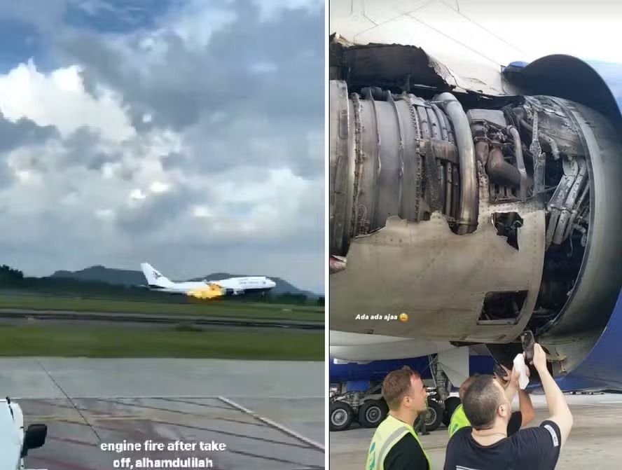 Motor de Boeing 747 pega fogo em decolagem na Indonésia.