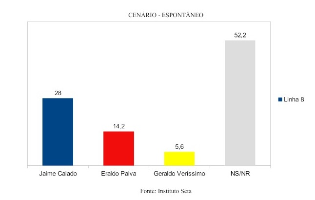 De acordo com o levantamento divulgado nesta quinta-feira (23), pelo Jornal das 6, na 96 FM, Jaime Calado teria 28% dos votos, contra 14,2% de Eraldo Paiva. Geraldo Veríssimo aparece com 5,6%.