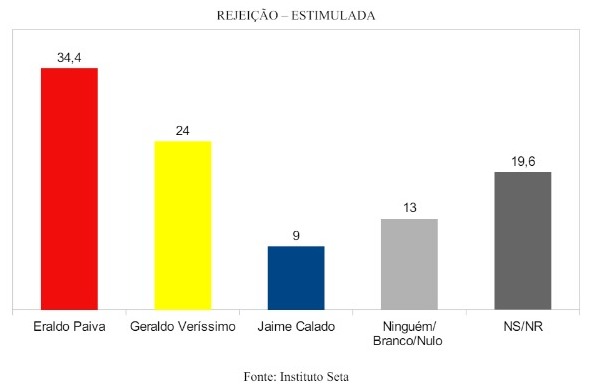Pesquisa realizada pelo Instituto Seta em São Gonçalo do Amarante mostra que o atual prefeito Eraldo Paiva é disparado o mais rejeitado pelos eleitores com 34,4%. Geraldo Veríssimo tem rejeição de 24,4% e Jaime Calado, de 9%.