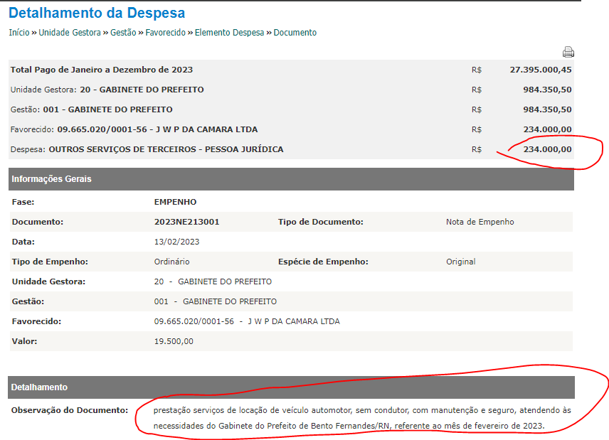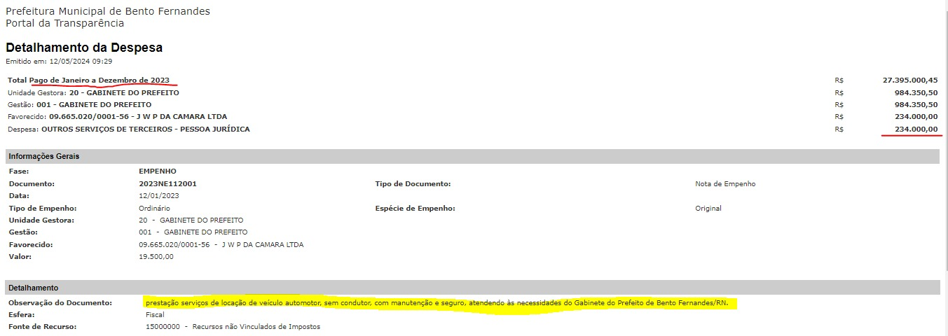 Os dados extraídos do próprio portal da transparência mostram que em 2023 o prefeito Júnior Marques gastou R$ 234 mil reais na locação de uma S10 4x4 a disposição do seu gabinete.