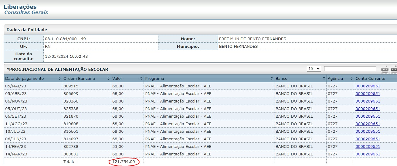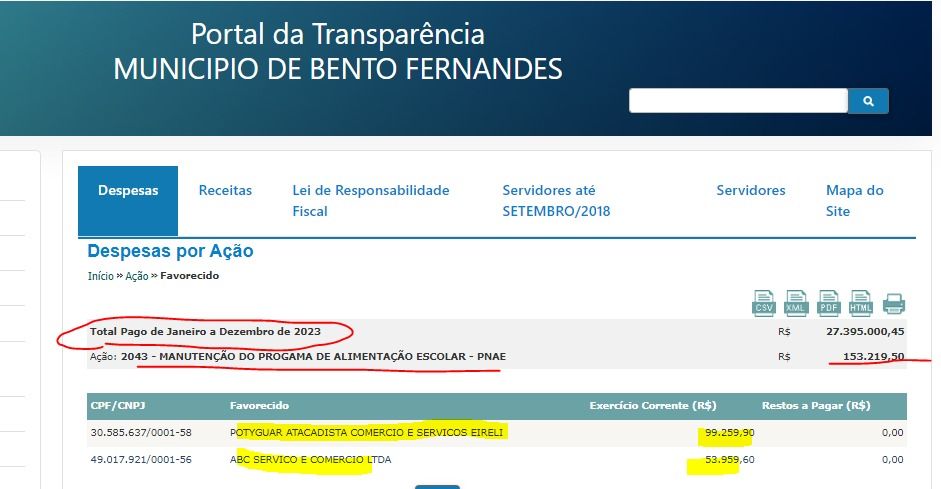 Já as despesas com alimentação escolar, que mesmo assim ainda vem recursos do governo federal, ele só gastou pouco mais de R$ 25 mil reais, já que o município recebe do FNDE o total de R$ 122 mil reais para custear a merenda dos alunos, mesmo assim o investimento em alimentação escolar só chegou a R$ 153 mil reais.