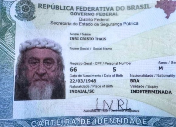 Na nova carteira de identidade, o líder religioso assina como “Inri” e aparece com uma coroa de espinhos de plástico na foto três por quatro. Como ele tem mais de 65 anos, o documento não possui prazo para expirar