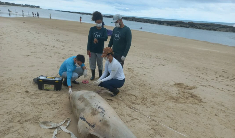Ele não apresentava marcas de interação com artefatos de pesca ou perfurações, mas o estado do rosto indicava um possível impacto sofrido pelo animal, o que pode ser a causa do óbito. Foram realizadas coletas de dentes e pele para análises laboratoriais posteriores e feitas as medidas biométricas.