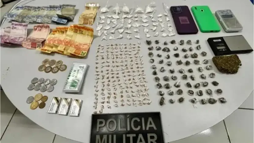 Na busca pessoal e veicular, foram encontradas 172 porções pequenas de substância amarelada, possivelmente crack, 54 porções pequenas de substância branca, provavelmente cocaína, 64 porções pequenas e uma média de substância esverdeada, possivelmente maconha, além de R$ 271,20 em espécie, sacos plásticos, lâminas, duas aparelhos celulares e duas balanças de precisão.
