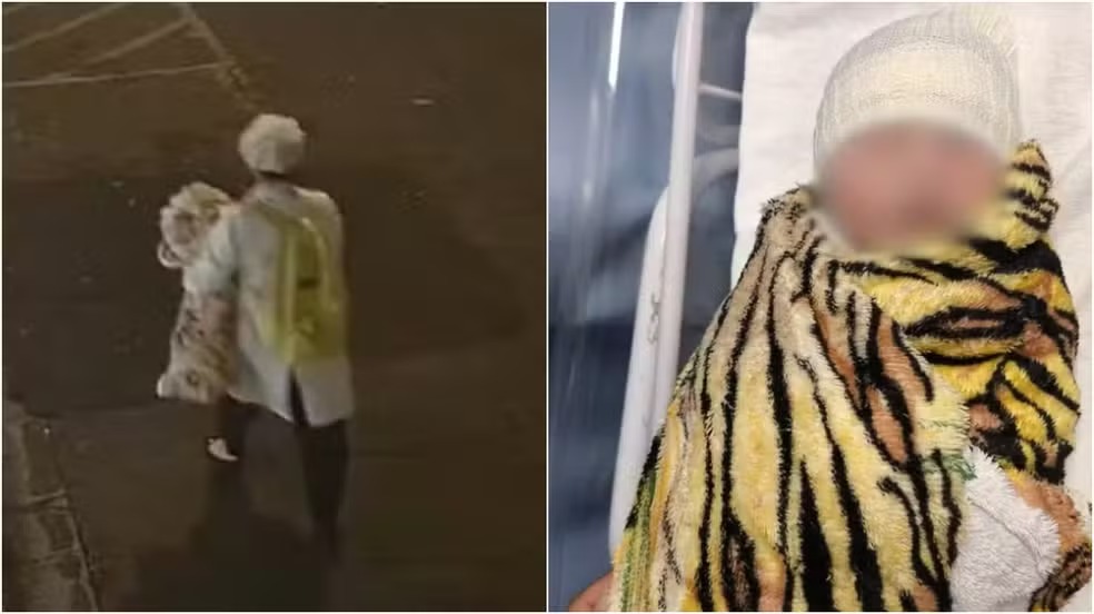 Um vídeo mostra a ação da mulher, do momento em que ela chega ao hospital com roupa de profissional de saúde e máscara cobrindo o rosto até a sua saída, carregando a criança.