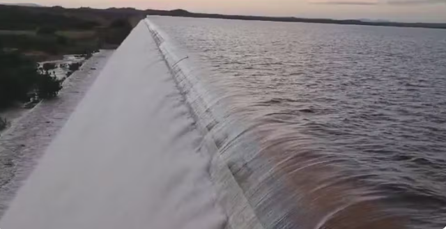 A sangria, como o transbordamento é conhecido, começou por volta das 3h30 e acontece pelo segundo ano consecutivo. Em 2023, a barragem sangrou no dia 9 de abril, depois de 14 anos.