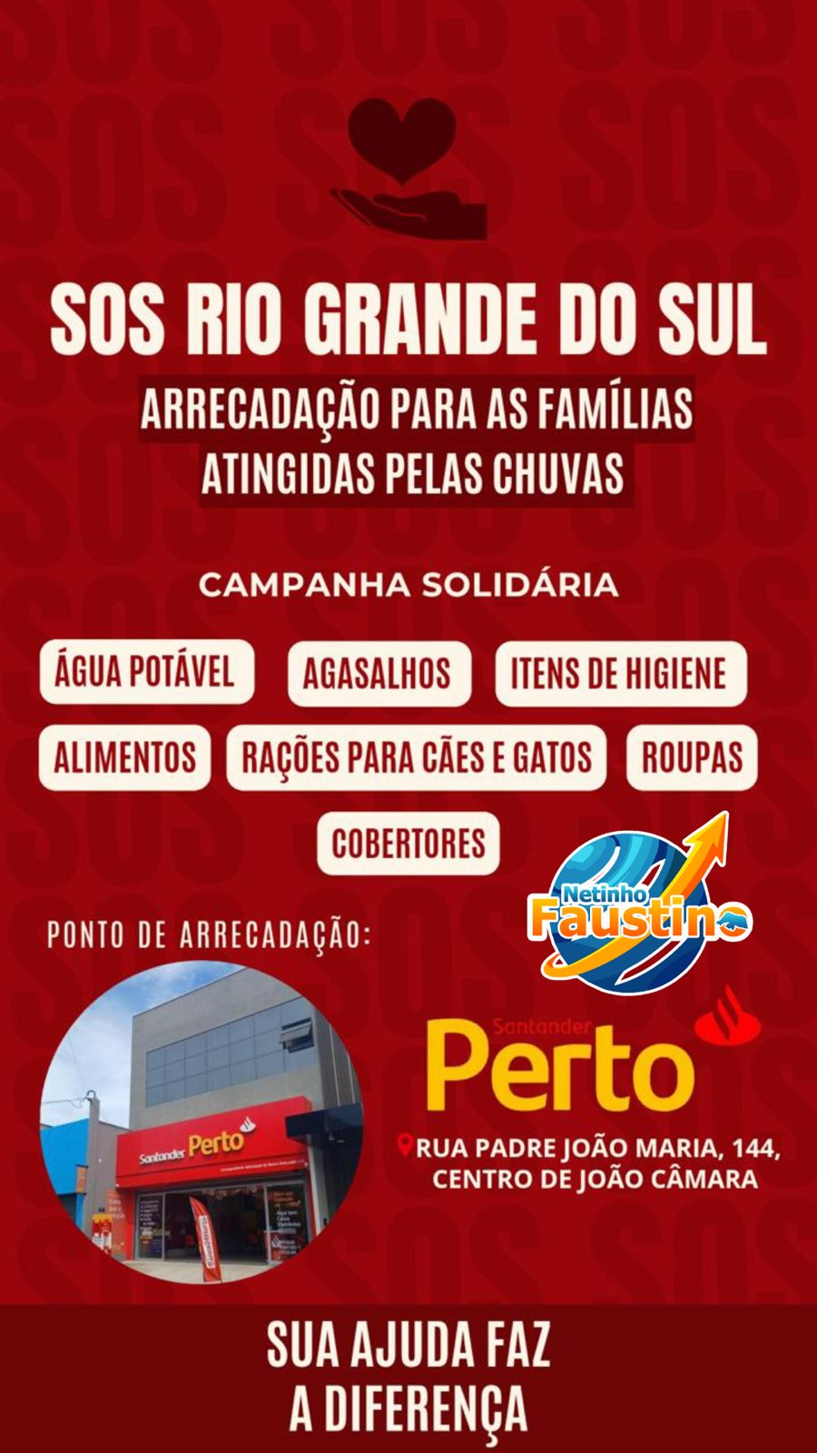 João Câmara: Santander Perto e Blog do Netinho Faustino iniciam campanha para as vítimas das chuvas no Rio Grande do Sul