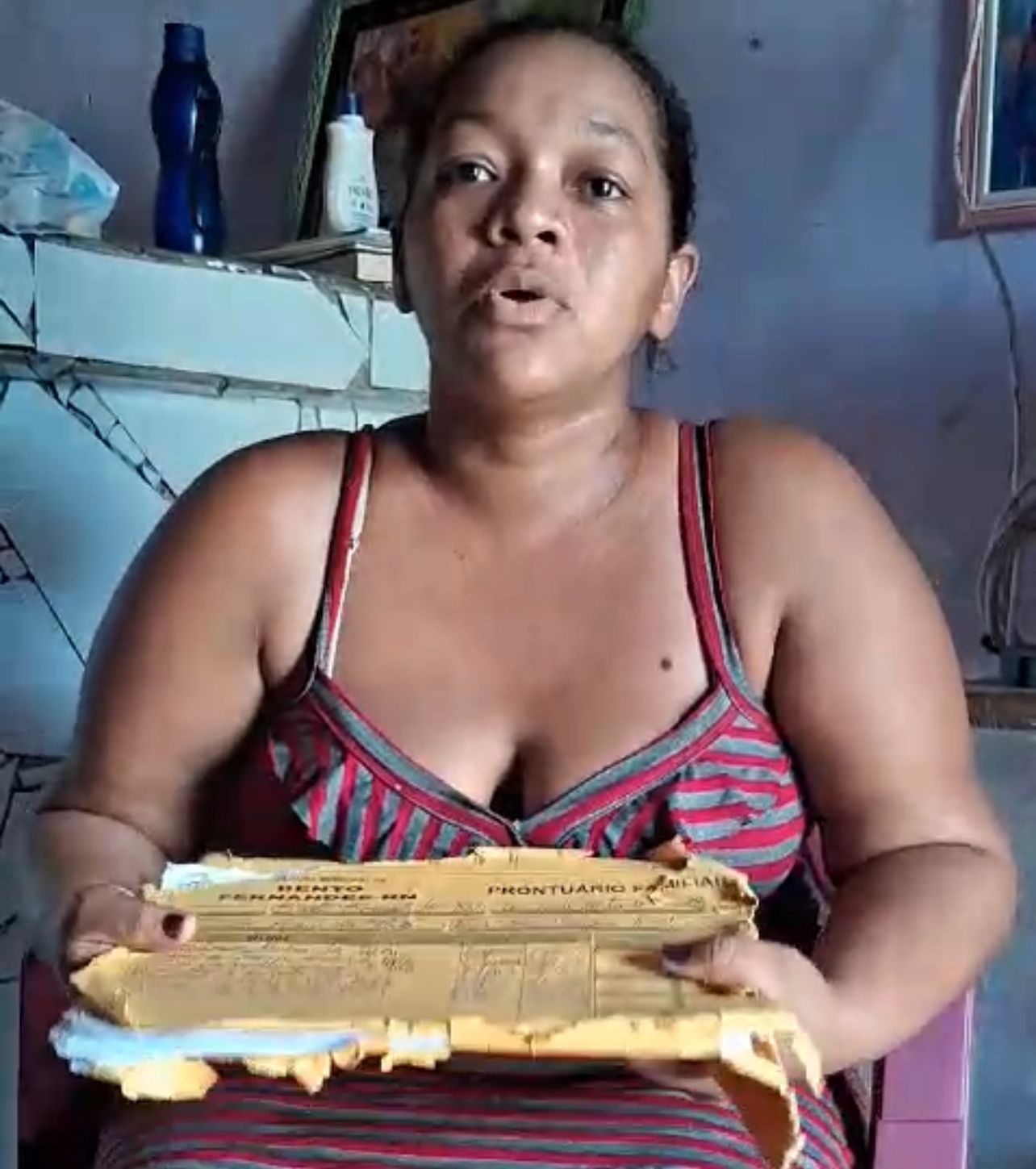 Dessa vez a senhora relata em vídeo que foi ao posto de saúde e que de inicio não encontraram o seu prontuário, porém ao passar das horas o mesmo apareceu nas mãos da secretária e segunda a paciente faltando as folhas do seu pré-natal.