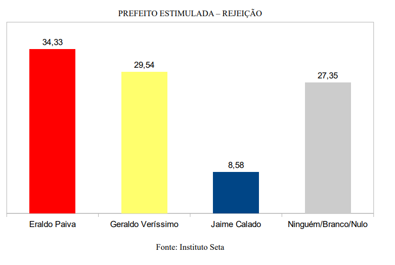 Eraldo Paiva foi o mais rejeitado por 34,7% dos entrevistados, Geraldo 29,5% e Jaime 8,5%, enquanto 27,3% não rejeitam ninguém.