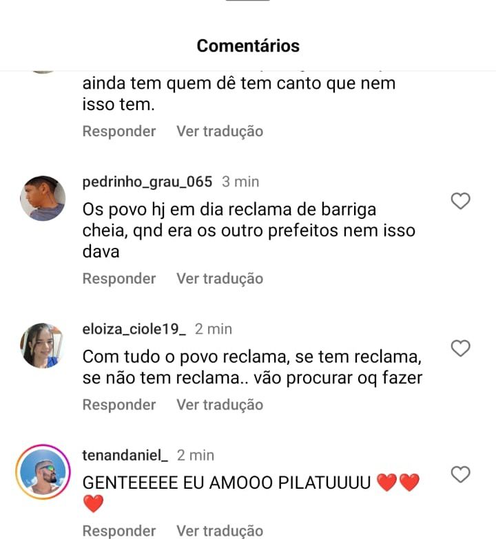 Nos cometários deixado por vários internautas da pra se notar o quanto o povo não compactua com esse tipo de publicação. Os comentários dizem assim: "EU AMO PILATO", outro internauta disse: " O POVO HOJE EM DIA RECLAMA DE BARRIGA CHEIA, QUANDO ERA OS OUTROS PREFEITOS NEM ISSO DAVA".